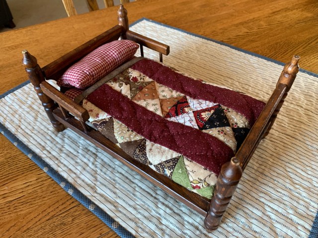 I finished up my little quilt and it fit perfectly on this little doll bed. I did use straight pins in the corners to keep it looking neat in the corners.