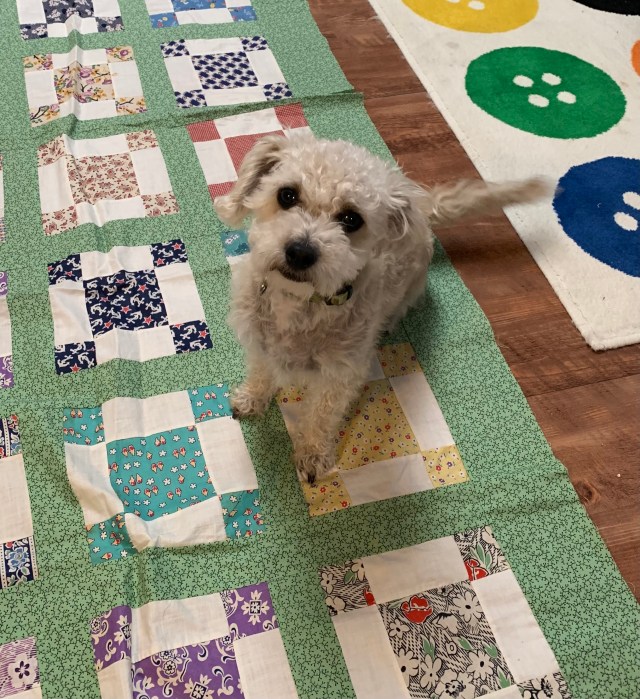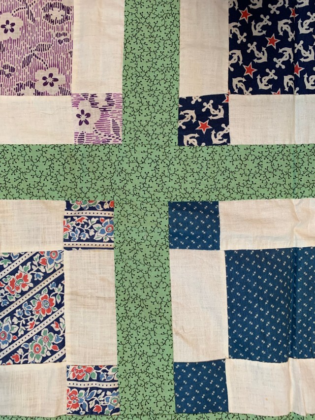 My parents gave these vintage blocks to me for Christmas decades ago. They were my very first vintage blocks and I was over the moon! I set them with this green fabric I found, but never finished the top.