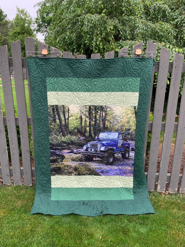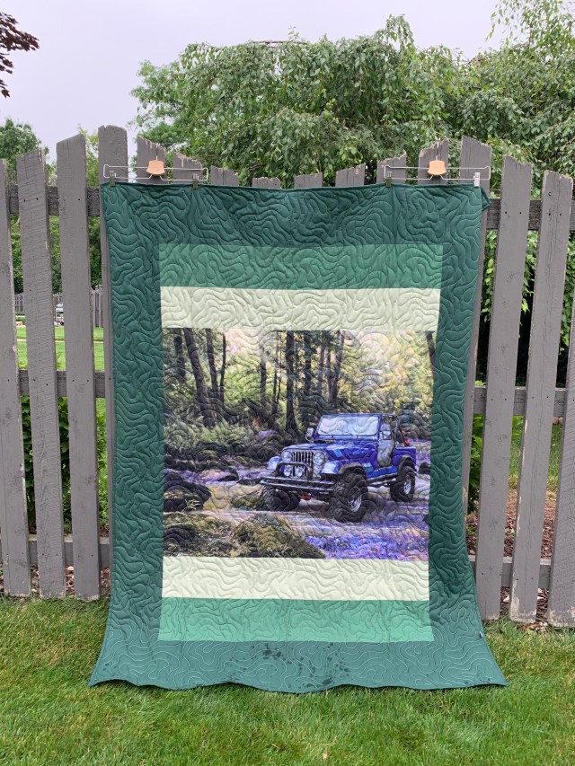 The Jeep quilt is finished just in time for the birthday party tomorrow.