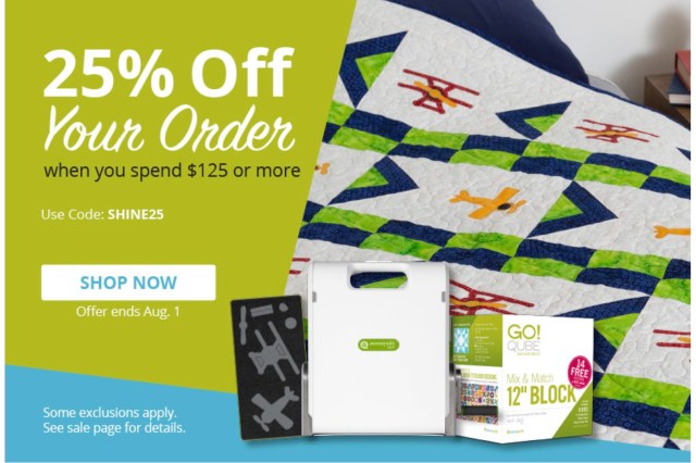 I would NOT have wanted to make this quilt without my Accuquilt dies and die cutter. So I wanted to share this deal with you. You can also get free shipping until August 2nd by clicking here.