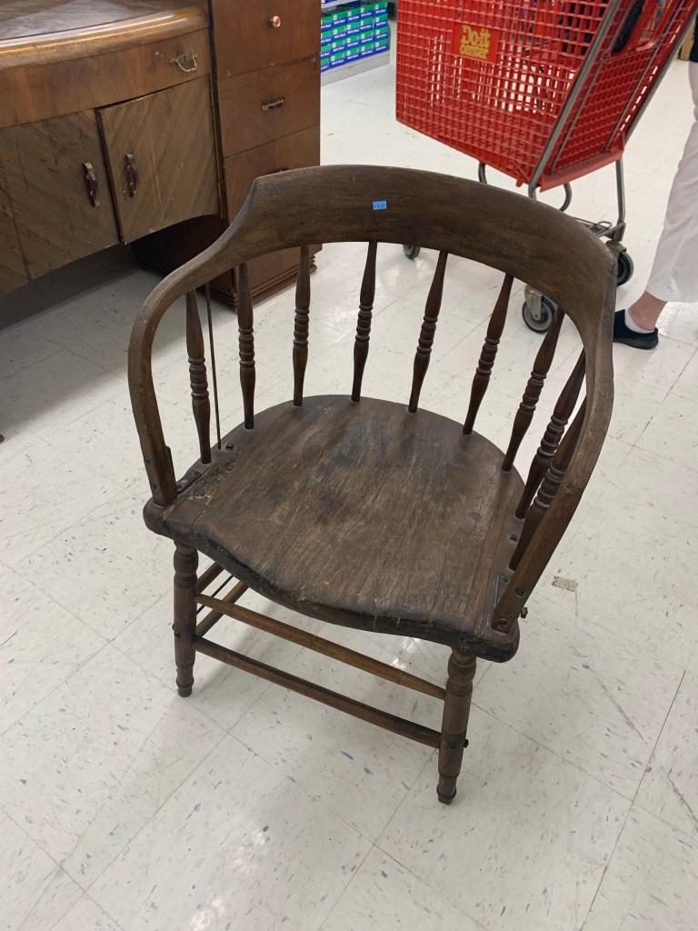 We love to thrift together, and I found this chair at Habitat Restore. For ten bucks, I had to bring it home. Daughter #3 did a bit of research and found out it is an antique saloon chair!
