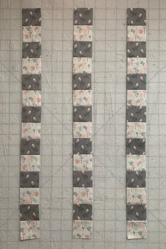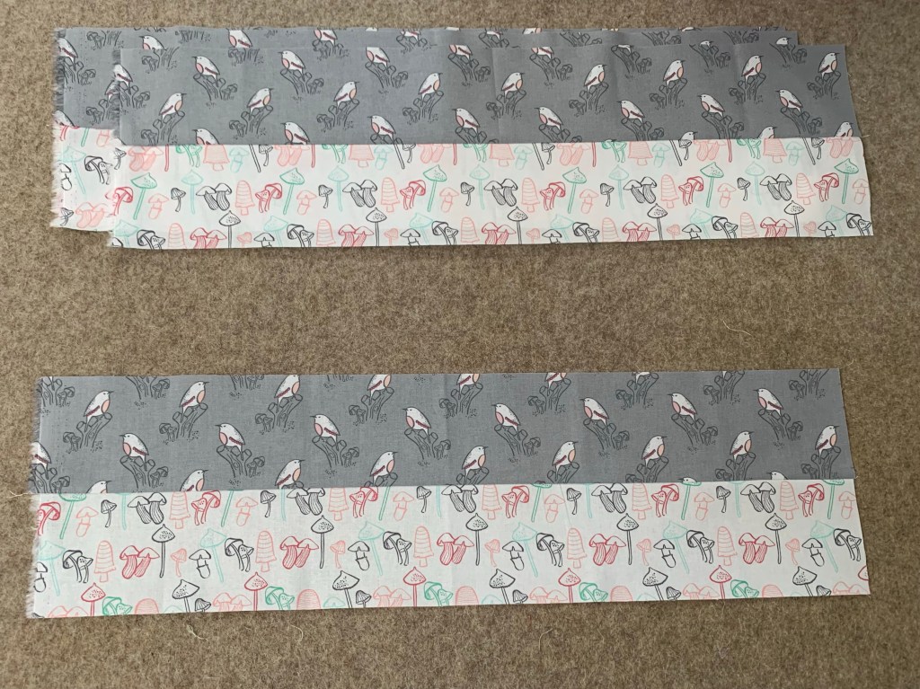 I started by cutting three inch strips from two of the fat quarters and sewing them into pairs.