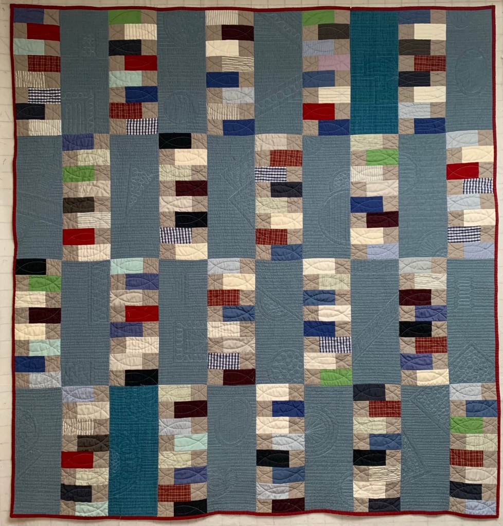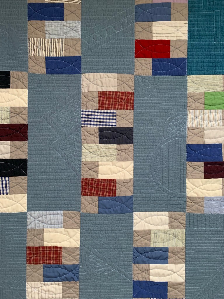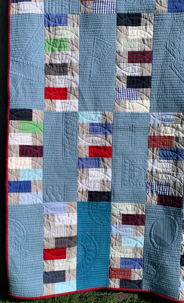Wow, really great custom quilting Katy and I love the visual design of this! The bonus of this project was all the longarm quilting practice you got. Thrown on a bed or a lap, I don’t think the wavy edge will be as apparent. Even if it is, as you noted the first rule of quilting is that every project is practice for the next even better one. The second rule is even a “not what I expected” quilt will keep someone warm!