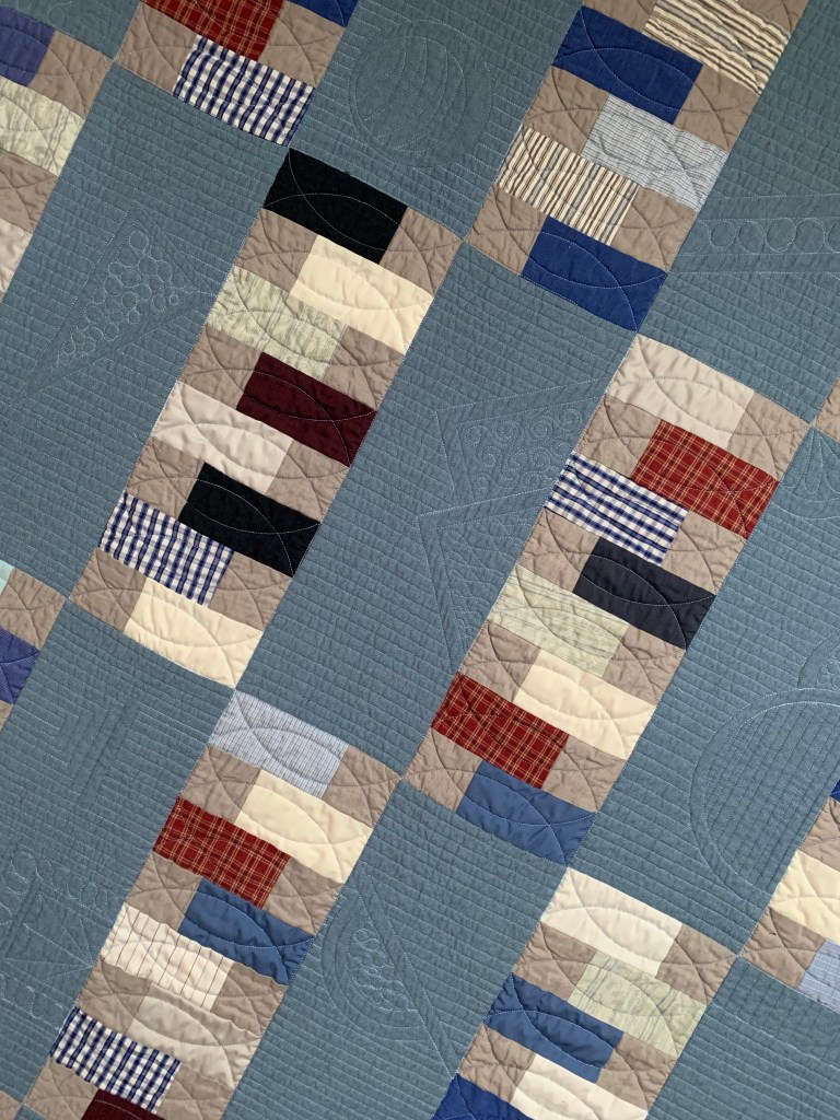 I should have known better. I used a Moda crossweave for the alternate blocks. I had forgotten how much this stuff shrinks. The shirting fabrics were obviously prewashed, but the crossweave was not. I also quilted more heavily in the alternate blocks than the shirting blocks.
