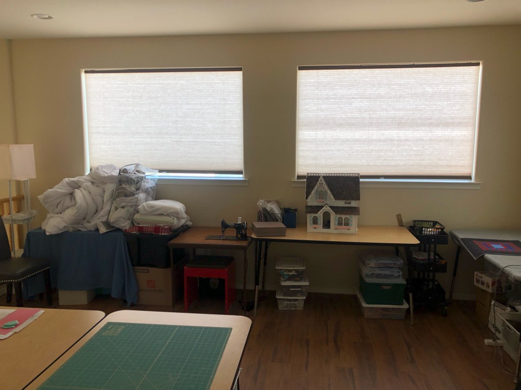 While preparing to head west, I began thinking of how I might improve my Arizona sewing room. I had Daughter #2 take these photos so I could see how I left it.
