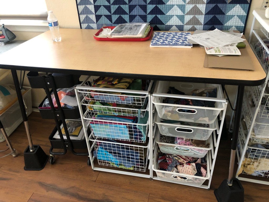 Hi Katy, Love seeing all your ideas, creations and sewing areas from the link you shared. My sewing area happens to be under construction/painting at this time. Still using it as I’m beginning to put things back, but undecided as to the where with a lot of it. I think I need to do on a trip to Ikea for fabric storage cabinets. I’m thinking under my cutting table long cabinet with lots of drawers of different sizes. Normally my hubby would just make them for me, but with the cost of wood these days and him so busy with his customers I guess I’m buying cabinets. I haven’t bought a cabinet in so many years. Looks like you’re looking for storage ideas too for your Arizona sewing area. I wonder if there’s an Ikea in Arizona. As you have great ideas for storage and use of the top of the lower cabinets too. Well time for me to go to work. Talk to you soon. Share pics as you go please. Thank you for all you do for Stitching Sisters too. No quilts headed your way as I figured you were getting ready to go to a warmer climate, lol Terri Bertalan