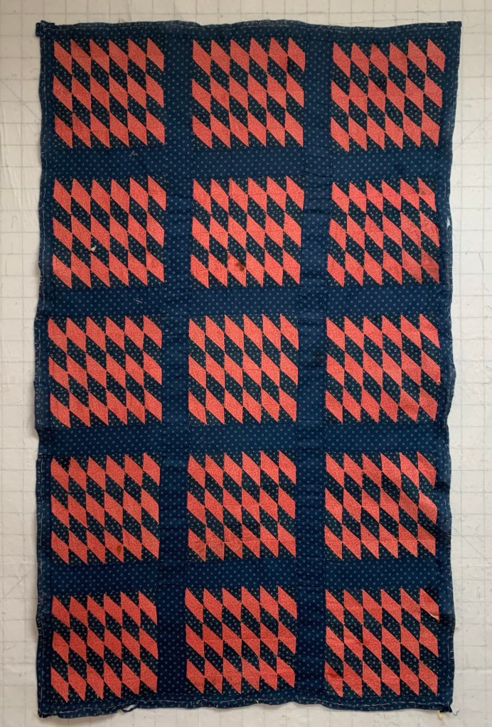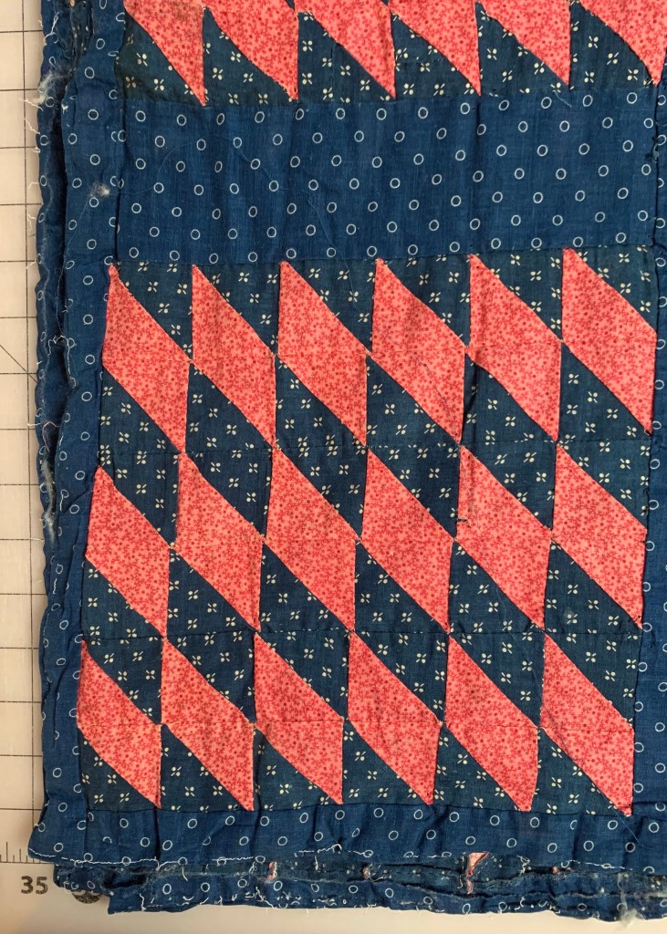 It’s hard to tell sizes from the photographs but it looks like maybe the seams on the back are narrower than 1/4″, which is something I’ve noticed on the few older quilts I’ve seen when seeing the back is possible. I also noticed the the quilter used the selvedge along the edge of at least one block.