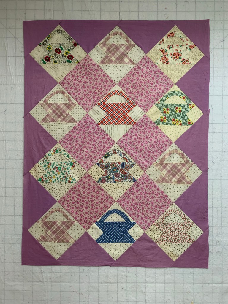 I’m a sucker for basket quilts anyway but I so like your combining the “old” with the “new” . It finished off so beautifully! Took me years to break that self imposed “can’t machine stitch on something vintage”. Thanks for showing that it can be done successfully!