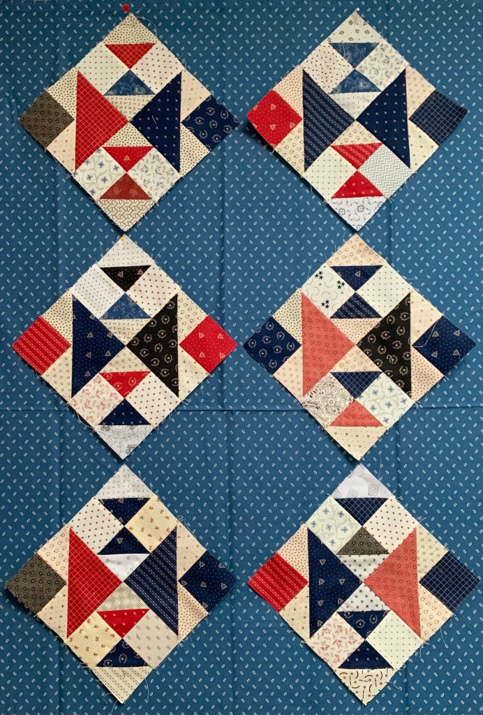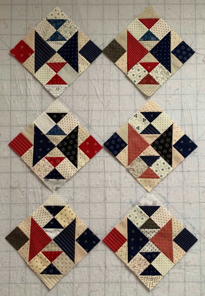 If they seem a little bit big, they are. Lori made 6 inch blocks and I made mine 8 inches. I did that because I had pieces cut that would work, but they were bigger. Works for me! Here is the layout.