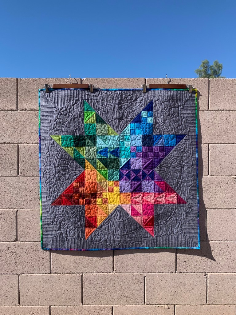 I recently participated in an online workshop by Emily at Aunt Em’s Quilts. I finished my top and even quilted it before heading out west.