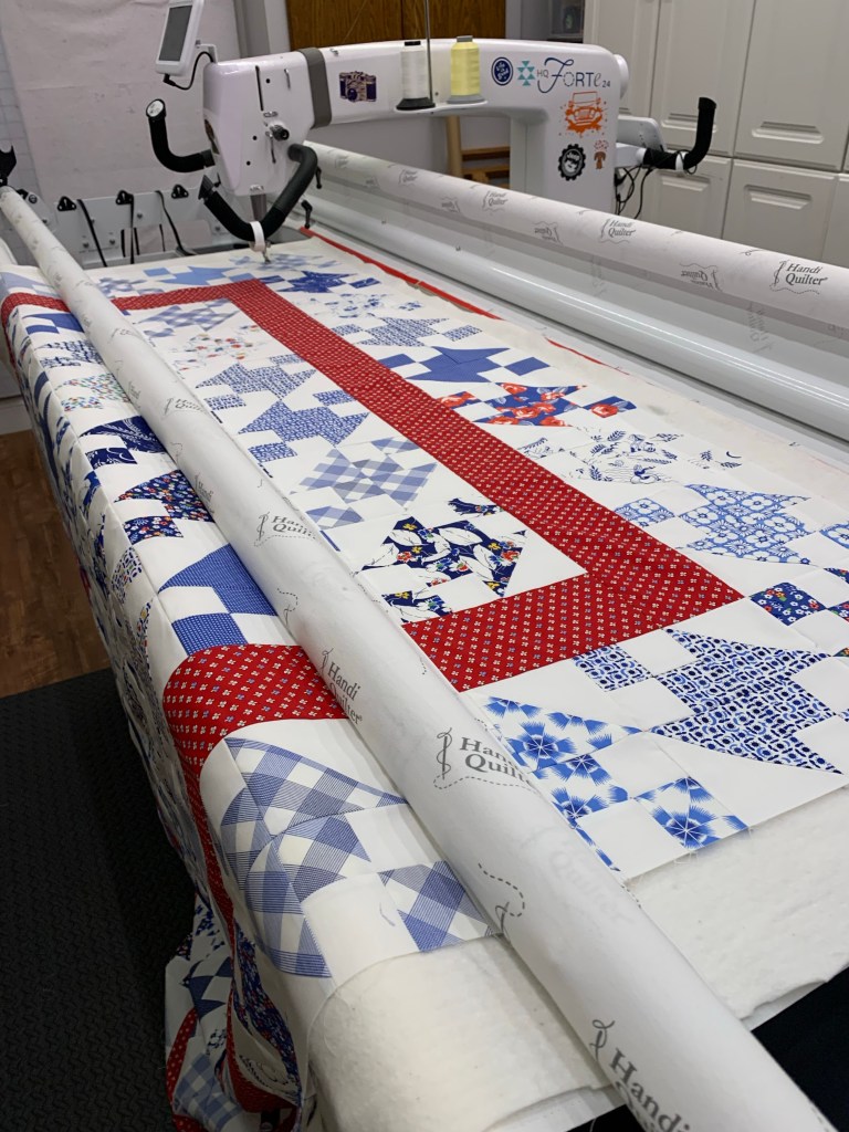 My long arm, Friday, has been getting a work out! My Buckeye Beauty top is loaded up.