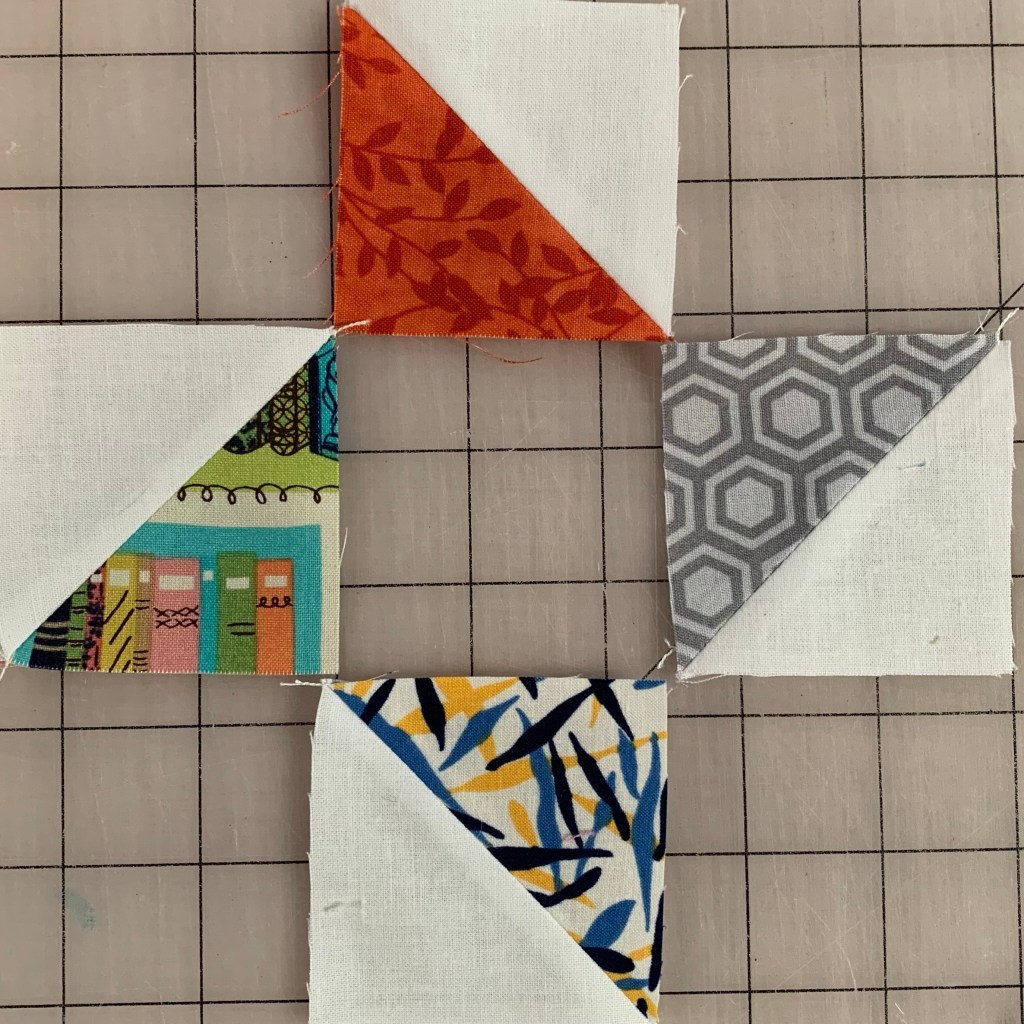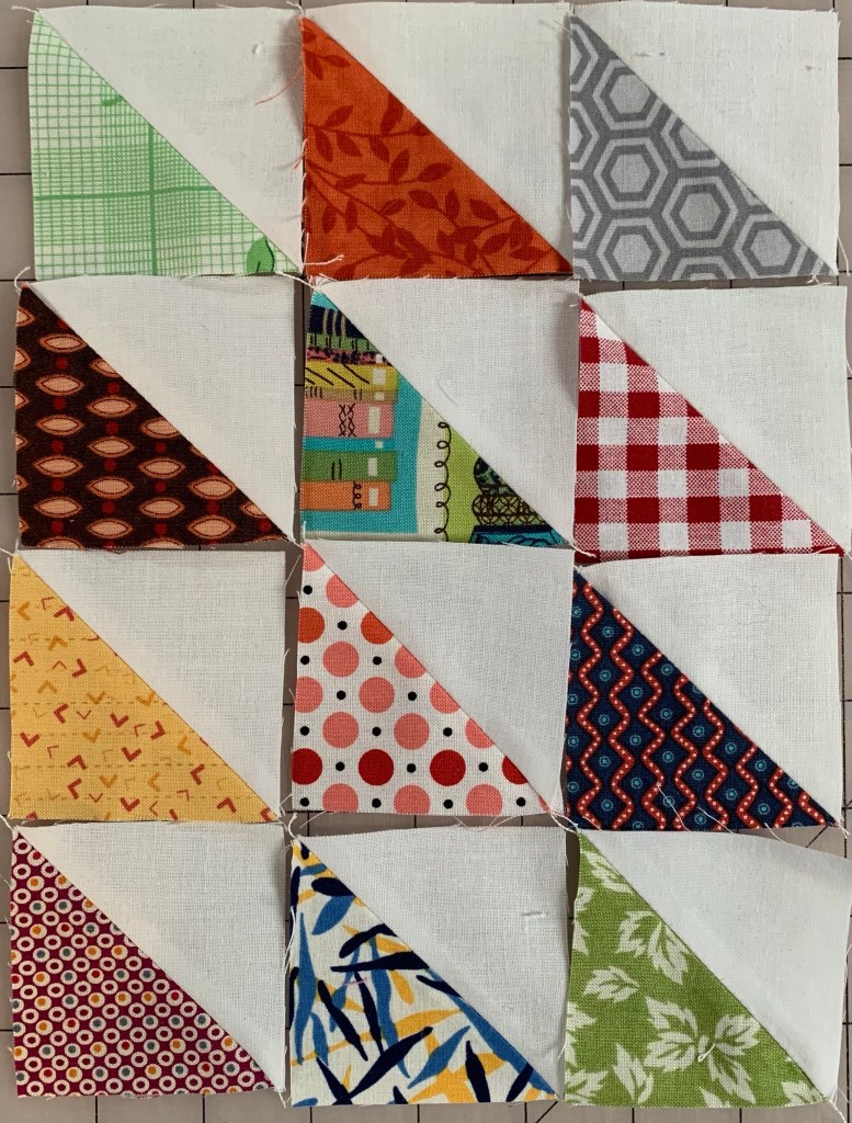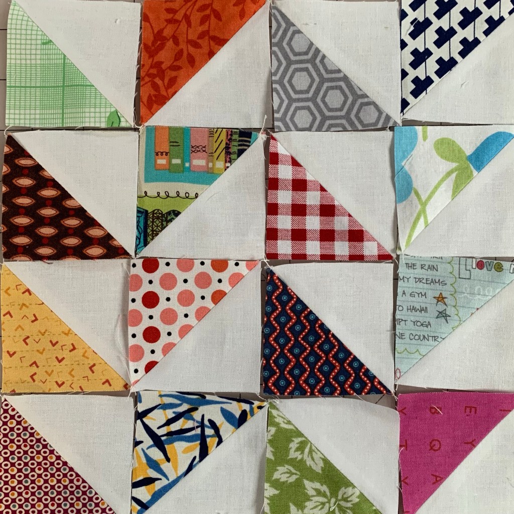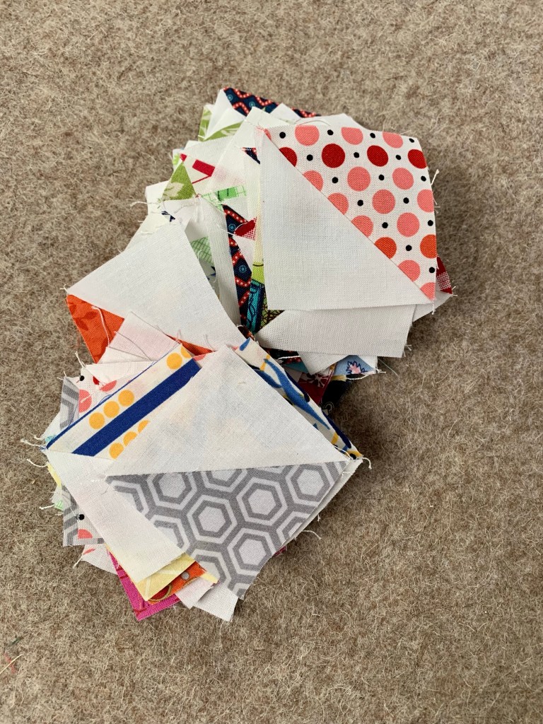 One day last week, I had just a little time to sew, so I looked around the sewing room for something to do. I came across my little bin of 2” HSTs and sewed them up.