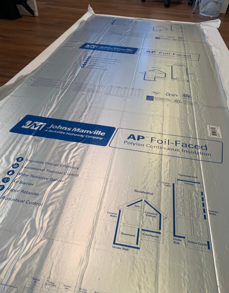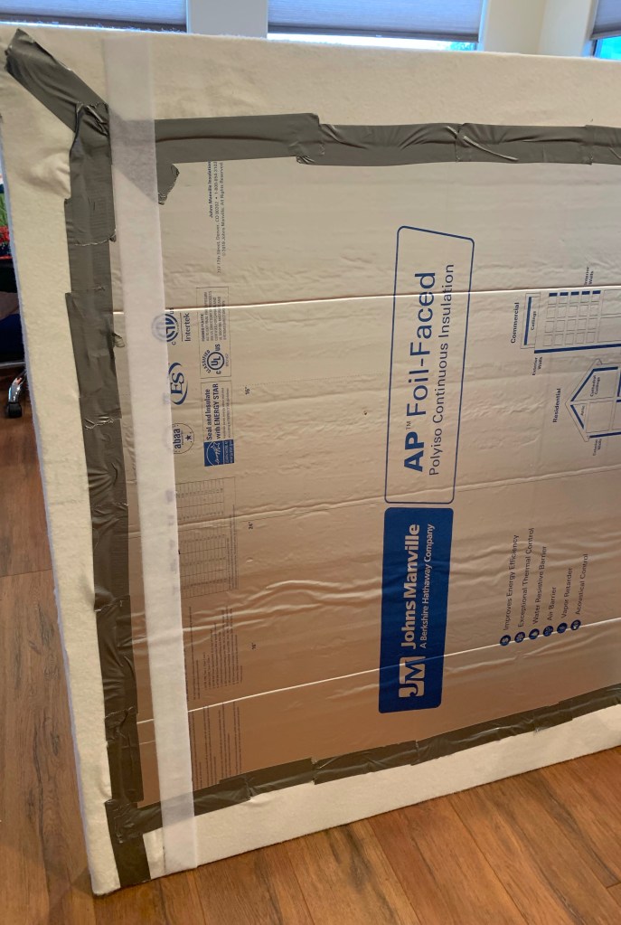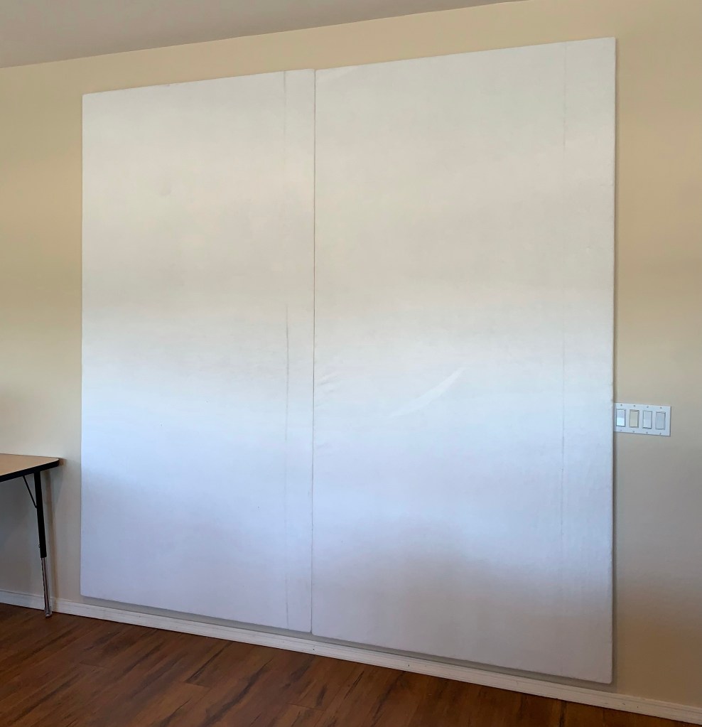 I covered each of two one inch thick pieces of foam insulated board with Warm and White batting. I stretched it and held it in place with pins, then I used duct tape to secure it to the back of the board.