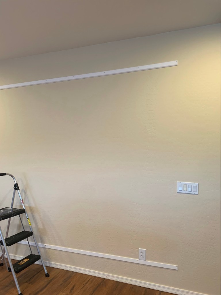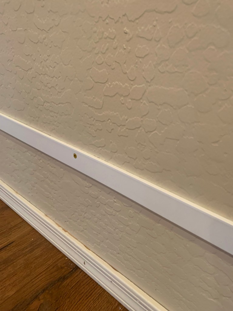 We bought two 8 foot lengths of this extruded plastic trim from Home Depot and screwed them to the wall 7 feet apart.