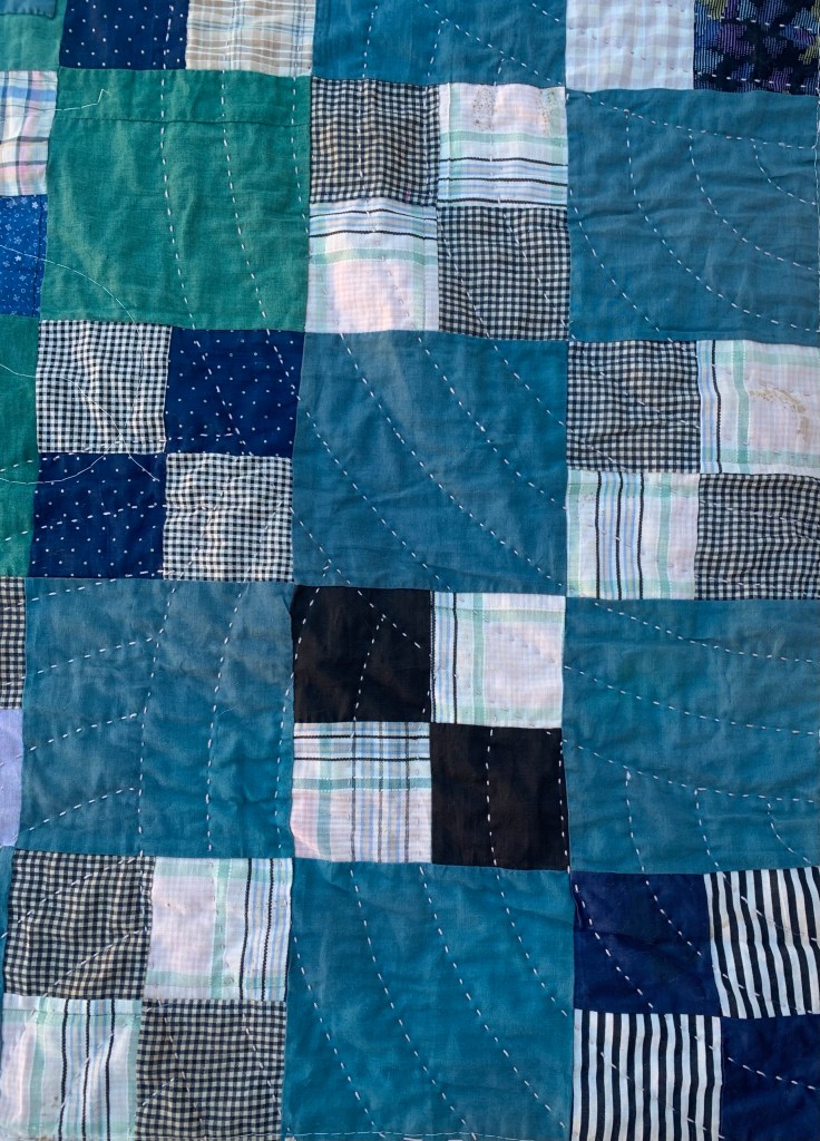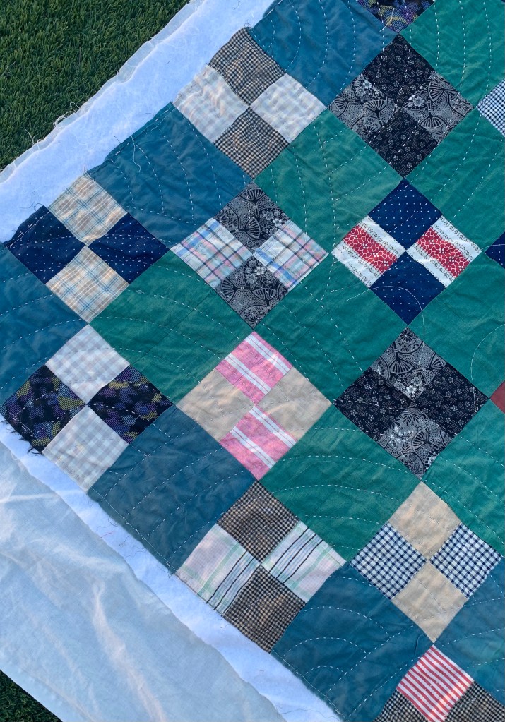 They show up best on the back. I normally prefer much closer quilting, but I think it works on this utility quilt.