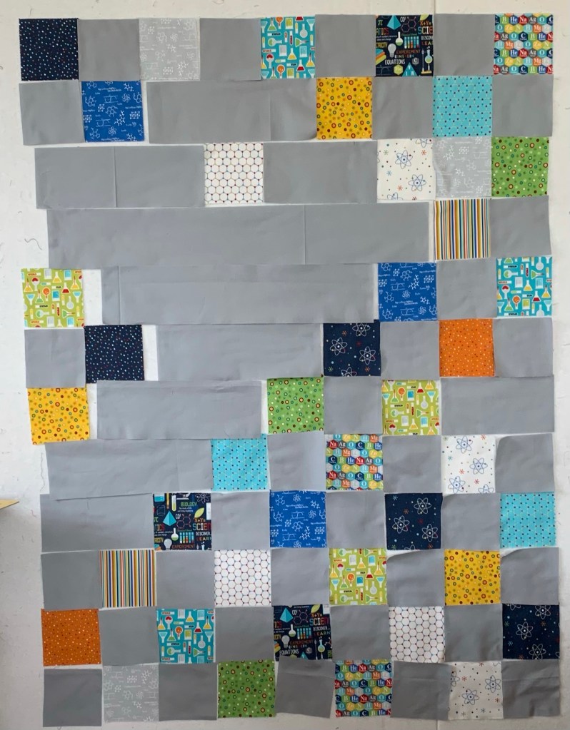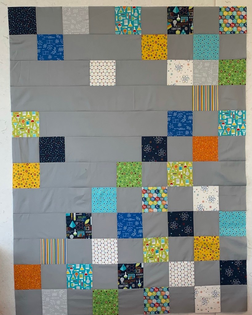 I like bigger baby quilts. I also wanted a more interesting layout than just alternating solid squares.