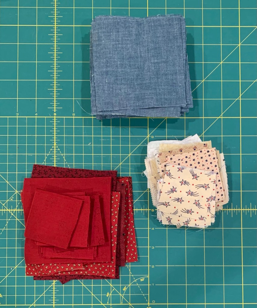 So easy! Just 4 chambray squares cut 4 1/2”, one red 4 1/2” square, and four red/neutral four patches. I used the dies from my AccuQuilt 8” Qube. That made the prep work really fast!
