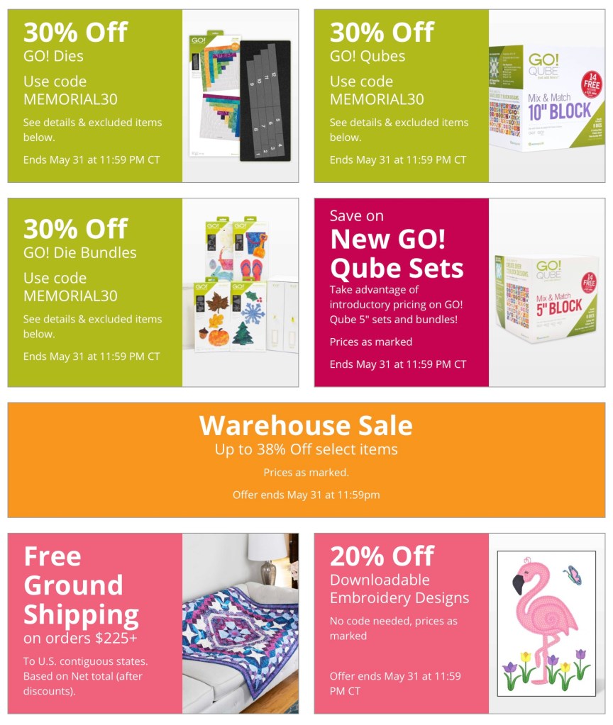 Before I go, AccuQuilt is having some great sales right now and continuing through Memorial Day weekend.