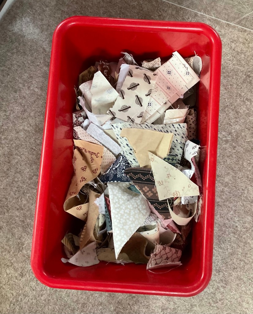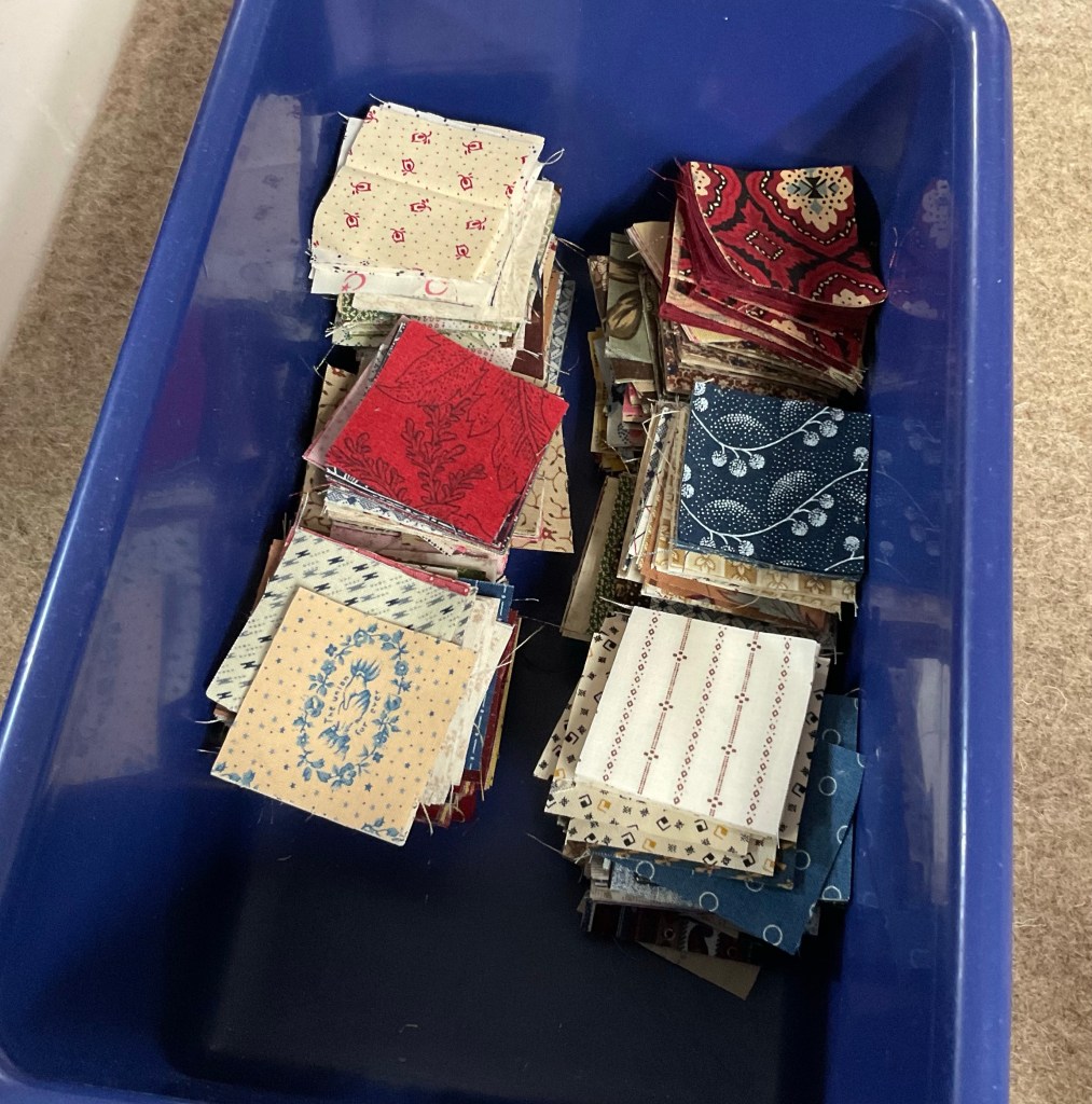 My scrap buckets are starting to overflow, so it’s time to deal with them. I have two buckets, one for reproduction scraps, and one for modern/bright scraps. I was down to zero 2” cut squares in repro fabrics, so I decided to focus on that.