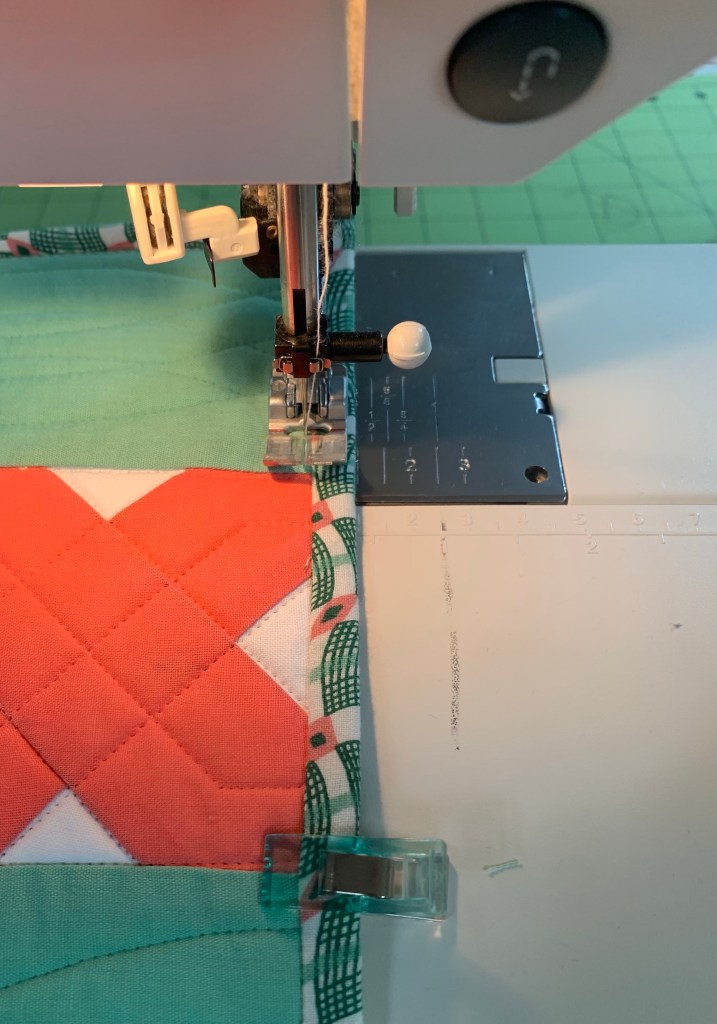 I started by cutting strips 1 3/4” wide and joining the end to end. This is single fold binding. I machine stitched my binding to the front of my quilt as usual, using a 1/4” seam allowance.