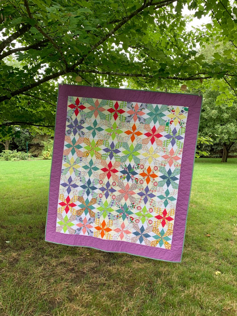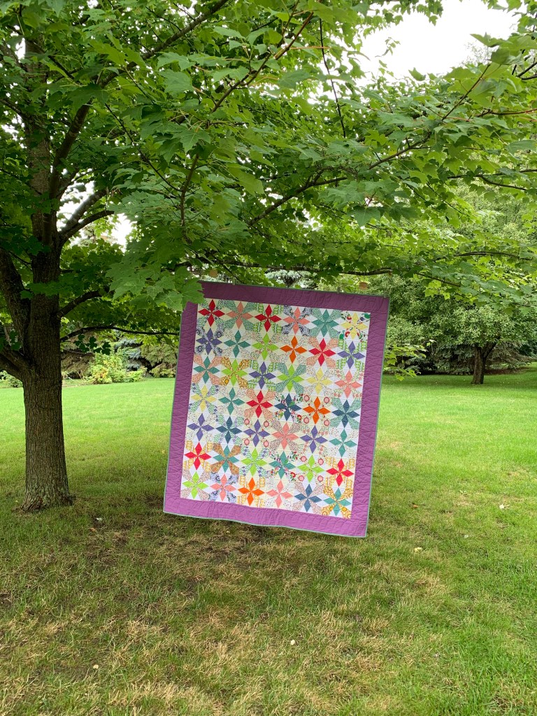 Wow! I couldn’t picture the quilt when I saw the individual blocks, but I really like the finished design. It has such great movement. No one will realize the two whites were a mistake unless you tell them. Thanks for sharing this great quilt.