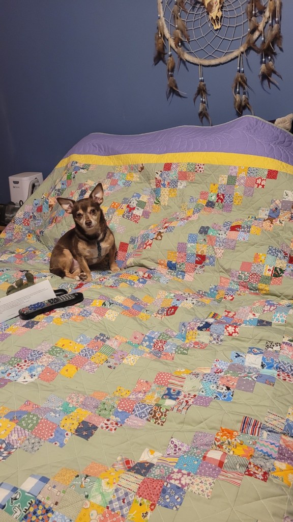 This gigantic quilt found a home as a wedding quilt for a friend. Her tiny dog, Henry , approves.