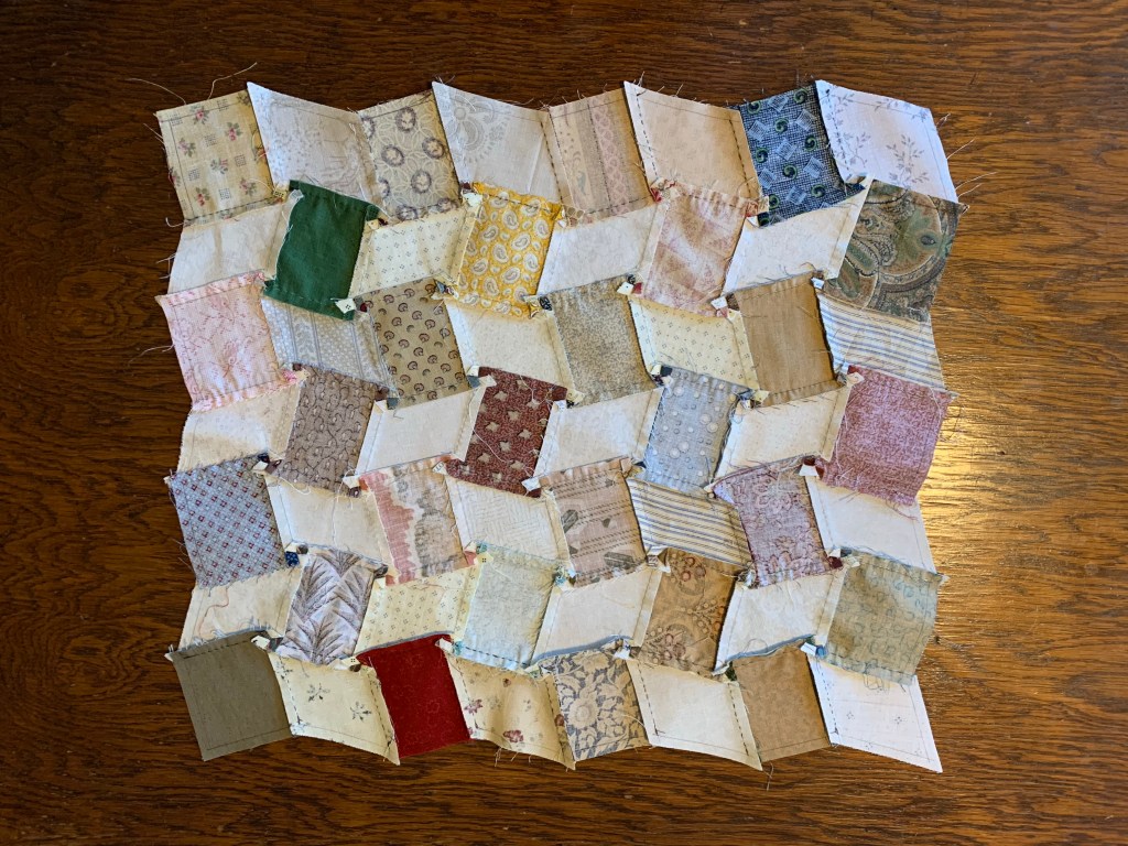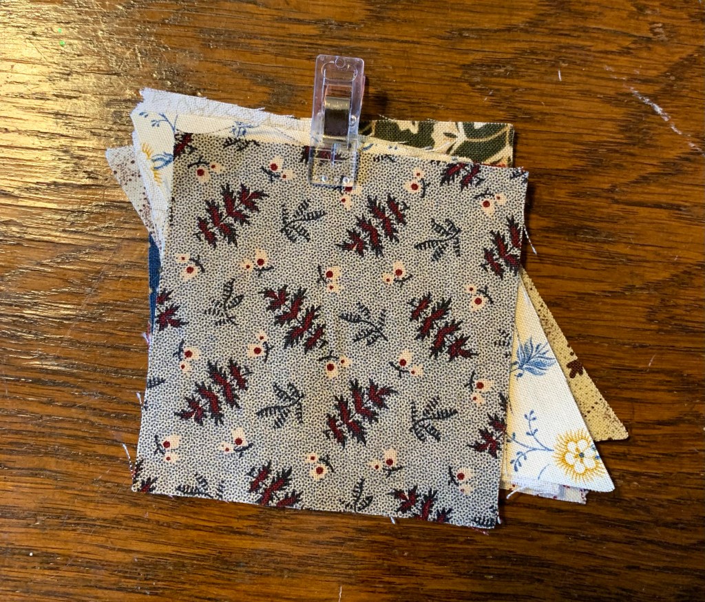 Then clip it together to keep things in order. Curiously, when I machine piece, I sew a row left to right. When I hand piece, I go right to left. I have no idea why; it just feels right.