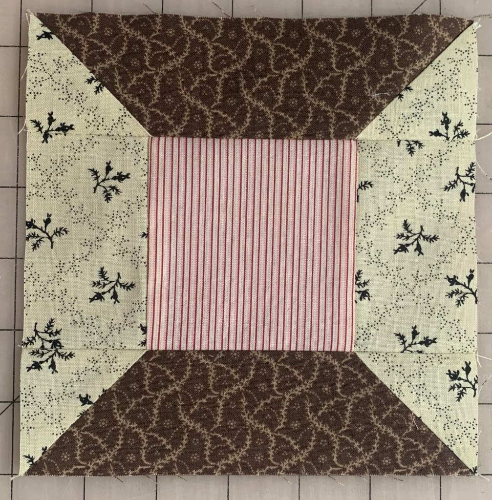 I substituted a single piece of fabric for the center. I thought I was so clever using a stripe fabric for the thread. Until I finished the block and realized I had it positioned wrong.