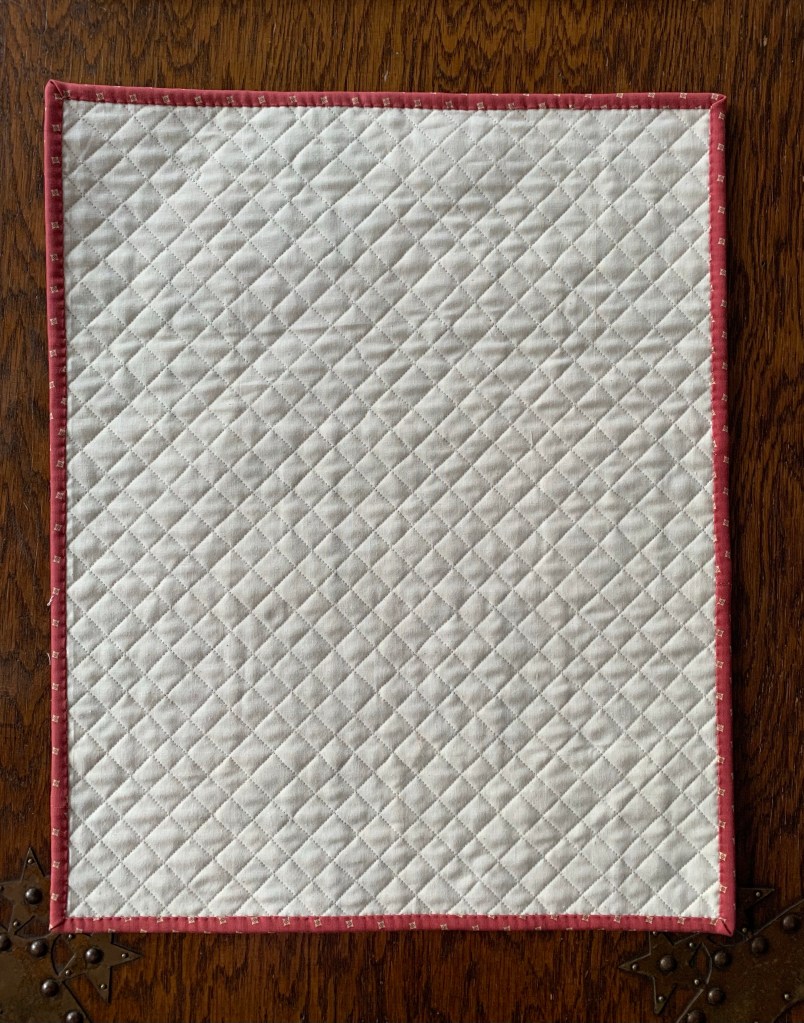 I just love this piece! My diagonal cross hatch quilting is far from perfect, but it isn’t noticed looking at it straight on.