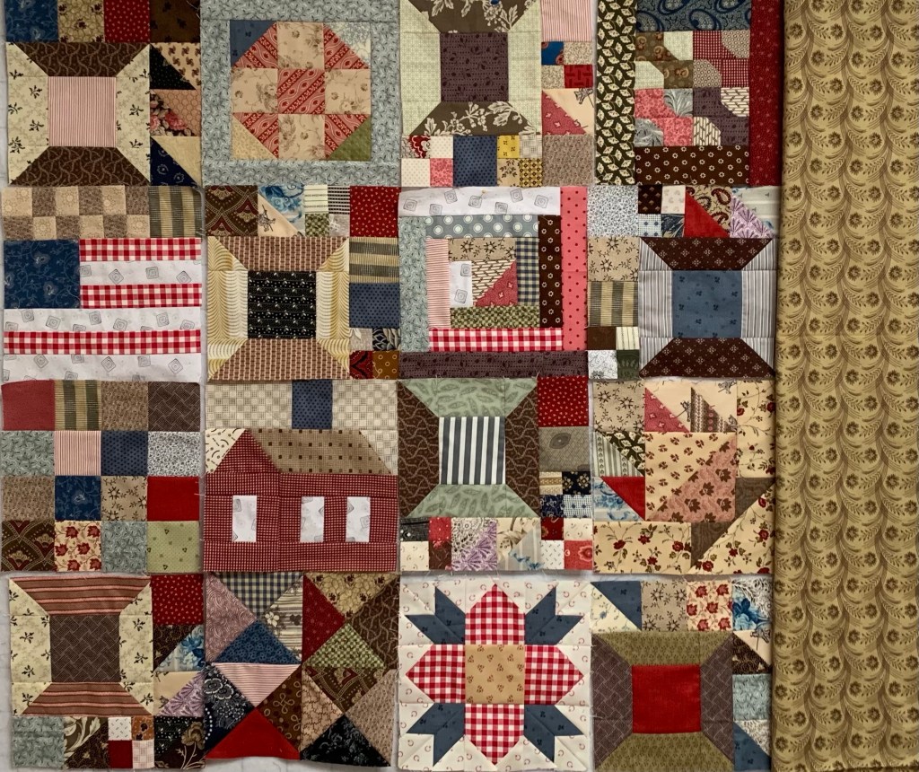Nov 8 you played in your string bucket. Cut the string panels into quarter sq triangles, long side horzontal, make “hourglass” blocks as your alternate block, a la Bonnie Hunter. Just my thought. Fold some string units into the shape, audition them with these blocks to see if you like the idea. 🙂