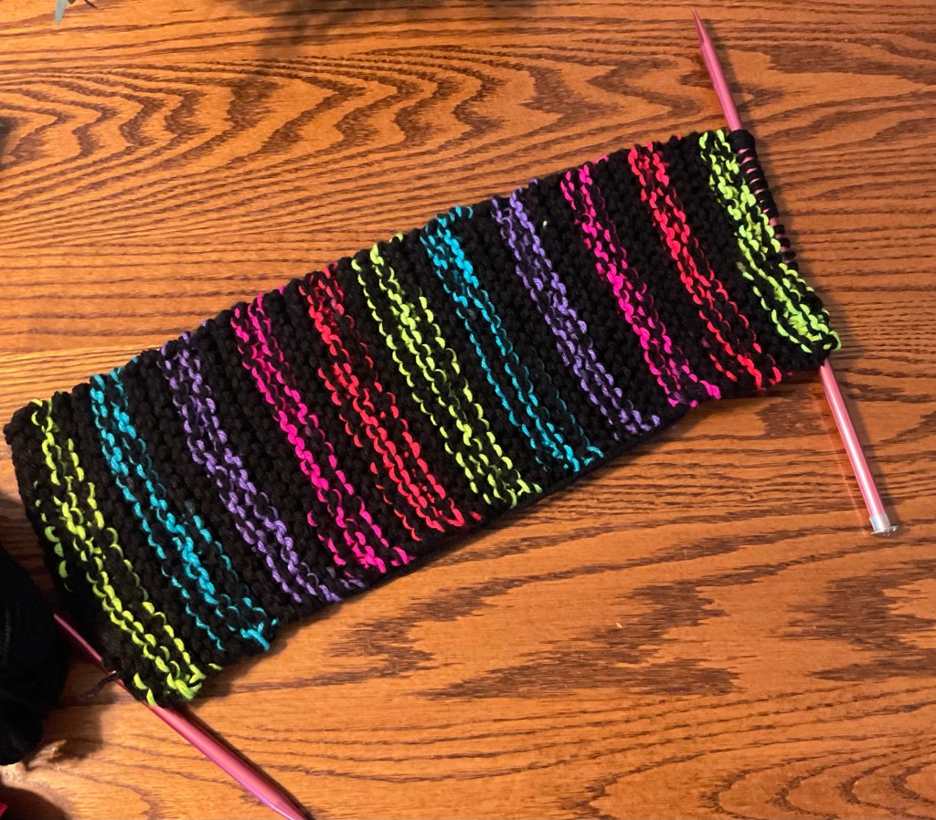This last one is coming along. I am knitting this one with the skein shown above together with a skein of plain black. Two strands means bigger needles, fewer stitches, and a faster finish.