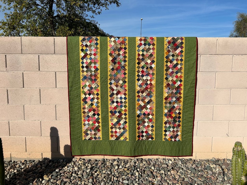 I mentioned before that I struggled with the quilting on this. The quilting in the three green center columns all ended up slightly different.