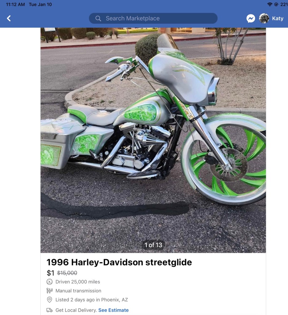 I left my motorcycle in Michigan this winter. My dear Daughter #2 has been letting me ride hers. But I still check out ads every day. I found this one…..