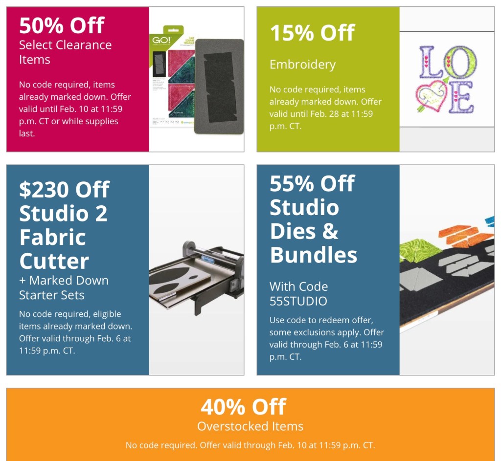 Before I go, AccuQuilt is running some great deals right now. 40% off Overstock items, 50% off Clearance, 15% off embroidery downloads and more!