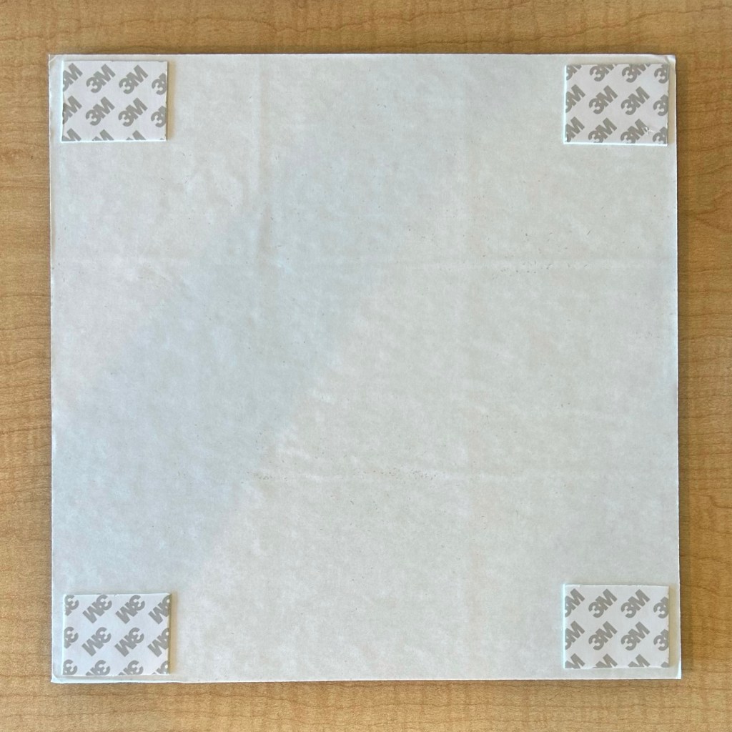 Then I used a level and pencil to mark plumb lines. This shows the back of a tile after adding the 3M tape.
