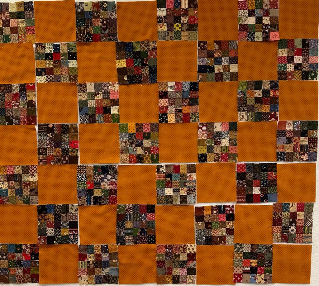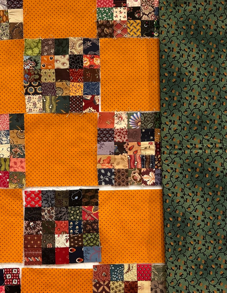 I came across this very old piece in my stash and I love how it looks with the cheddar and scrappy squares.