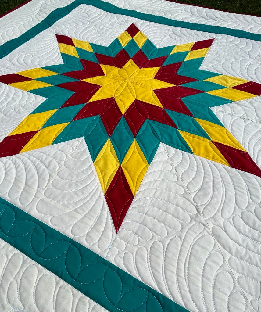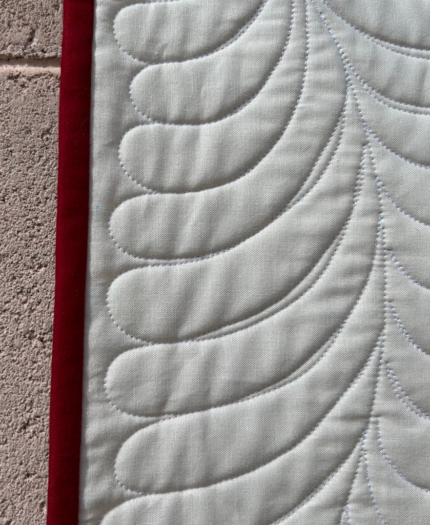 I took the time to mark guidelines for my feathers using a blue washout pen. These photos were taken before washing the quilt. I do try to remove the marks as I go, but you can likely see a few spots here and there.