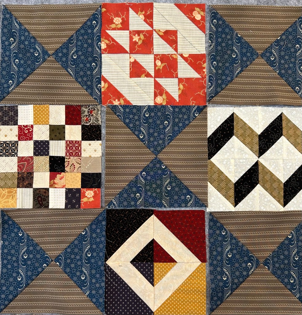 I love your choice of brown/taupe and blue for the hourglass blocks. I see the stars but they are not dominant. For me, the on-point squares surrounding the pieced blocks stand out much more strongly. My opinion is, if you’re happy with the size and the two corners don’t bother you too much, call it finished. Unless you’re going to add a border?
