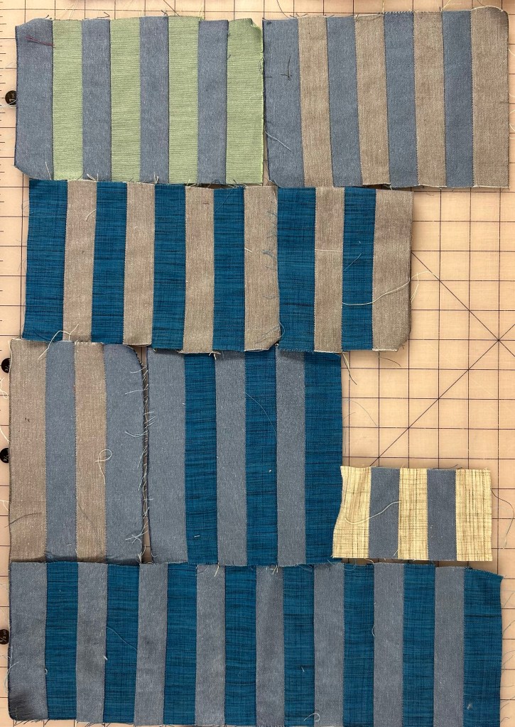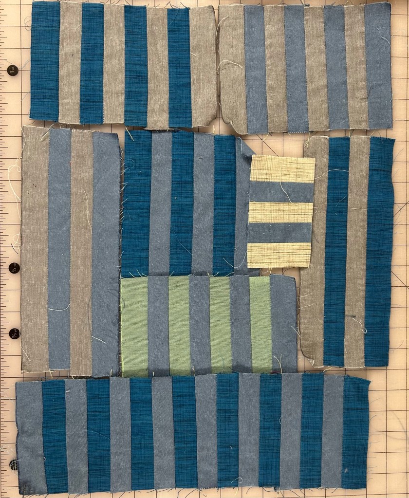 I’ve tentatively finished the top for the piece I shared yesterday. I’ve moved on to playing with some strip sets I pieced some years ago out of the same fabrics.