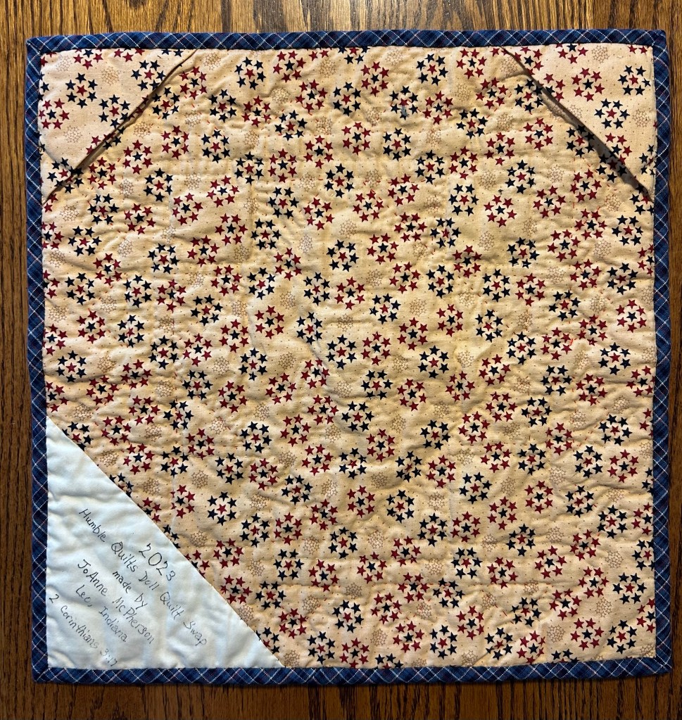 JoAnne did a fantastic job on this little quilt. I love its patriotic theme and her color choices. Lucky you!