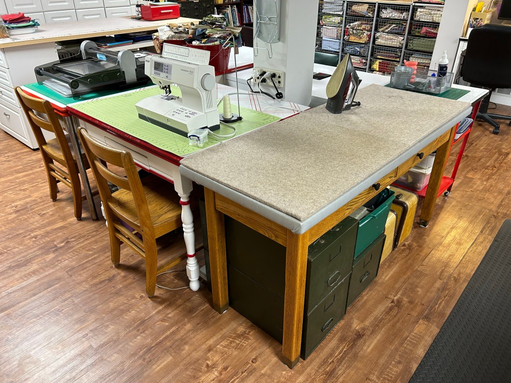 Your space looks great! Can you comment on how you made your big board ironing table? I just bought a used sideboard/buffet that I’m going to use as an ironing table, and am curious if you covered plywood with batting and heat resistant fabric for the top? And is it anchored to the table, does it slide around if not? Thanks for any tips you have!