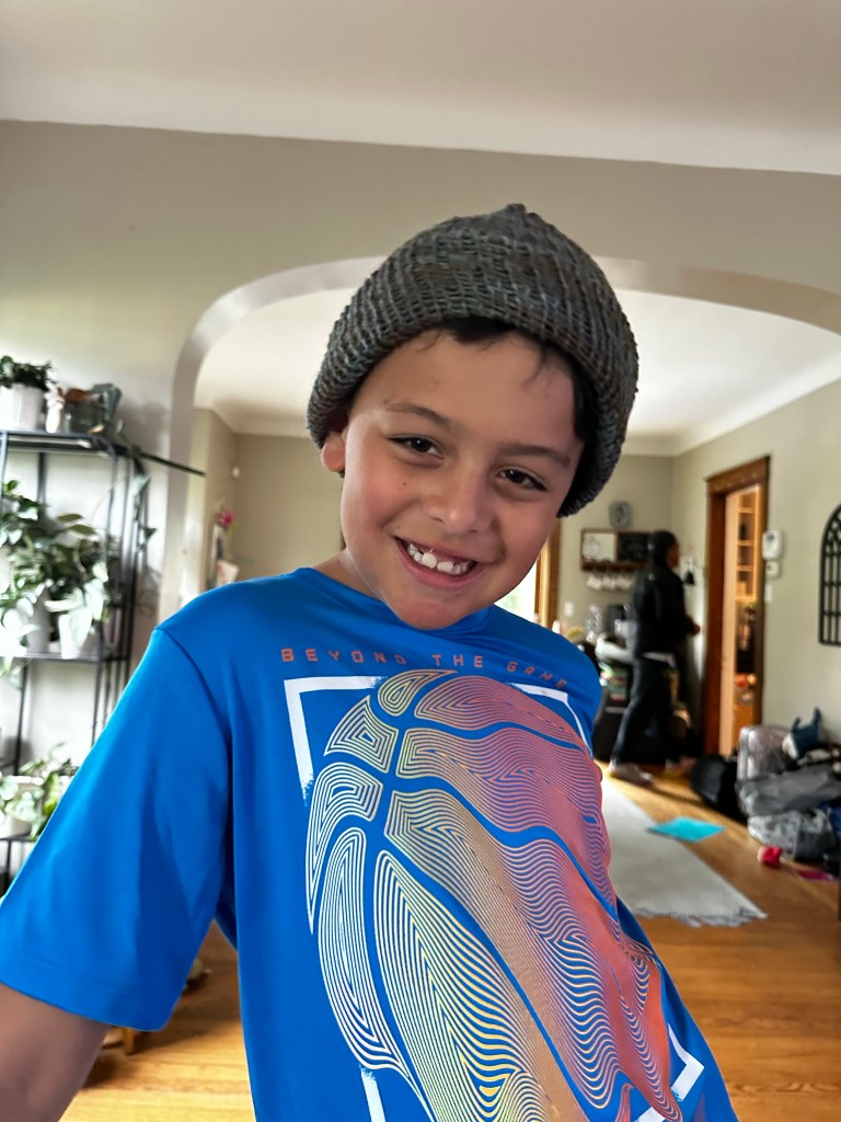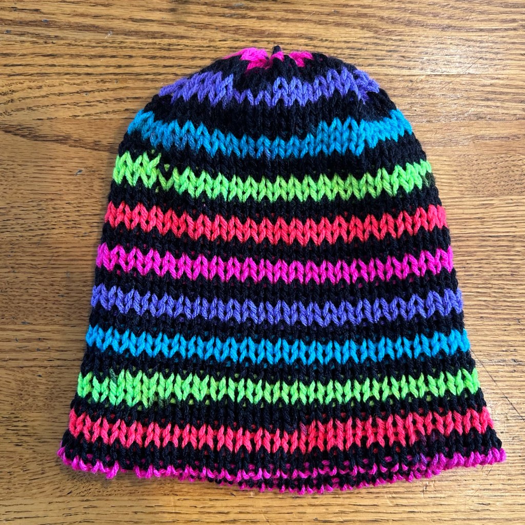 I tried several different types of yarn, but it seems to like regular old DK acrylic yarn best. I made this hat with some yarn leftovers from E2s Christmas scarf.