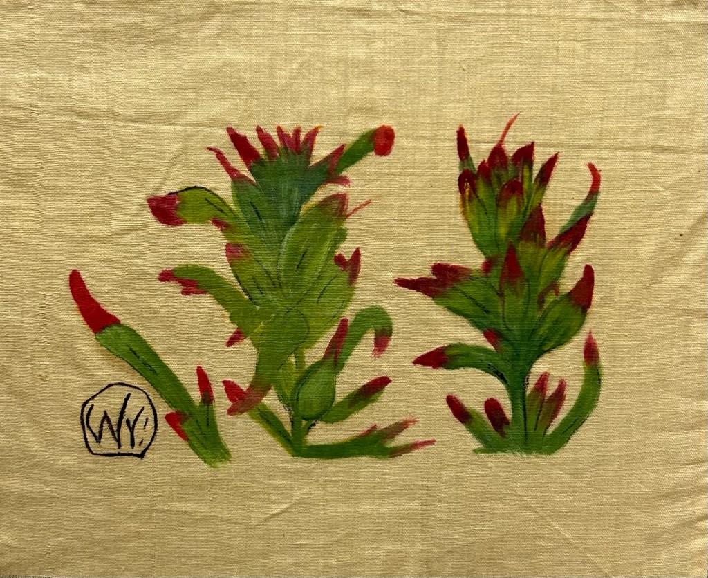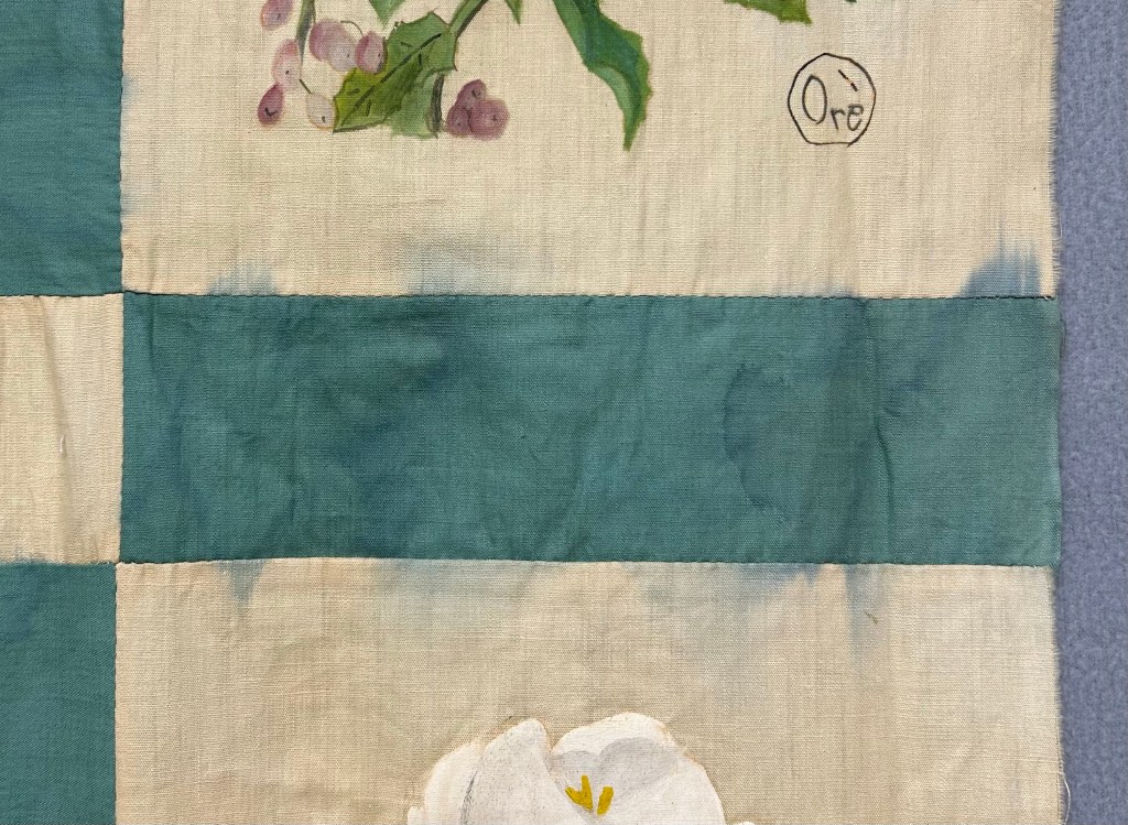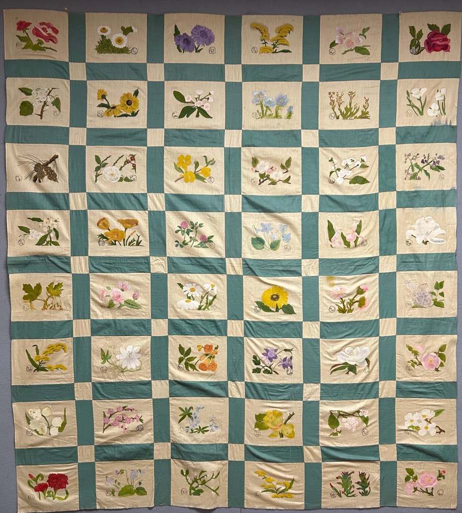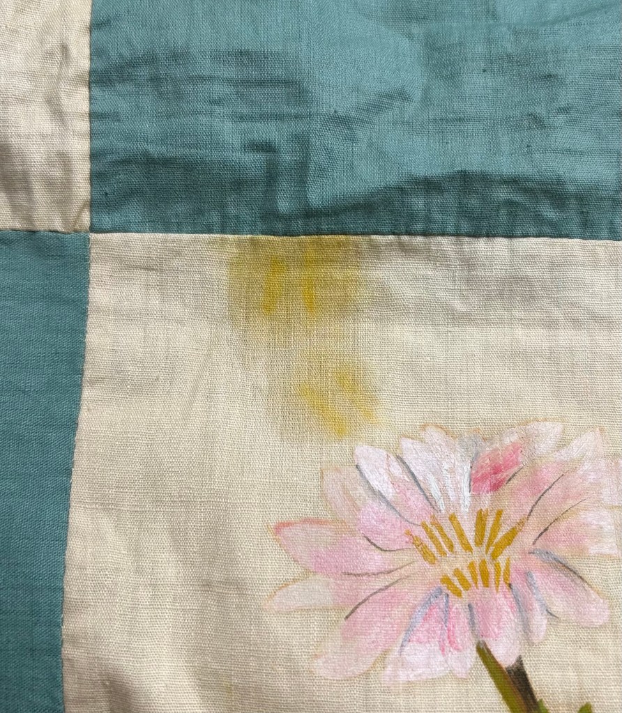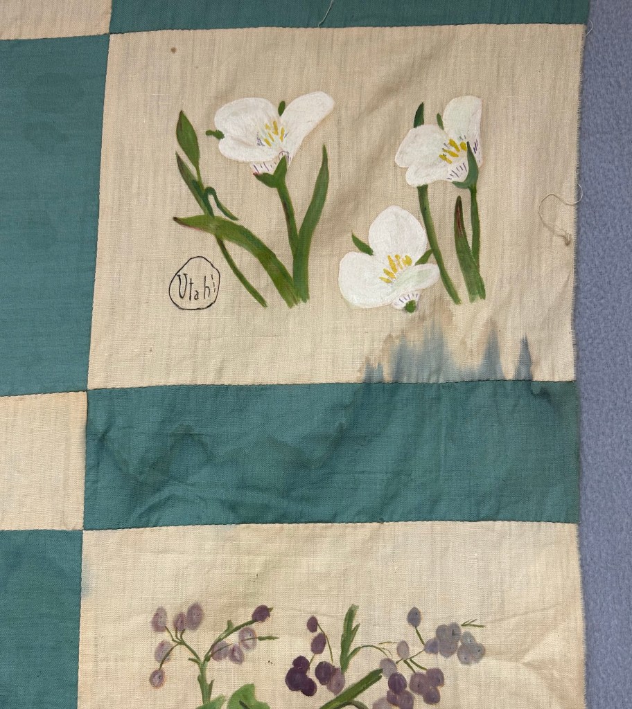 I picked this quilt top up at an antique fair. The blocks are painted with state flowers.