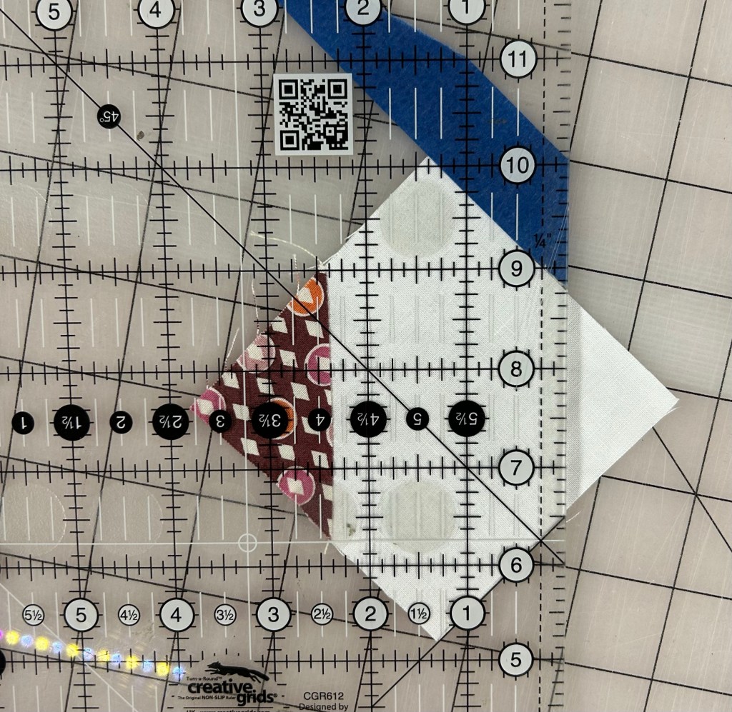 This is how I did it. The original pieces were cut using dies from my 12” Qube. So I needed to cut the opposite corner off. I used the 45 degree line on my ruler and a piece of painters tape on my ruler.
