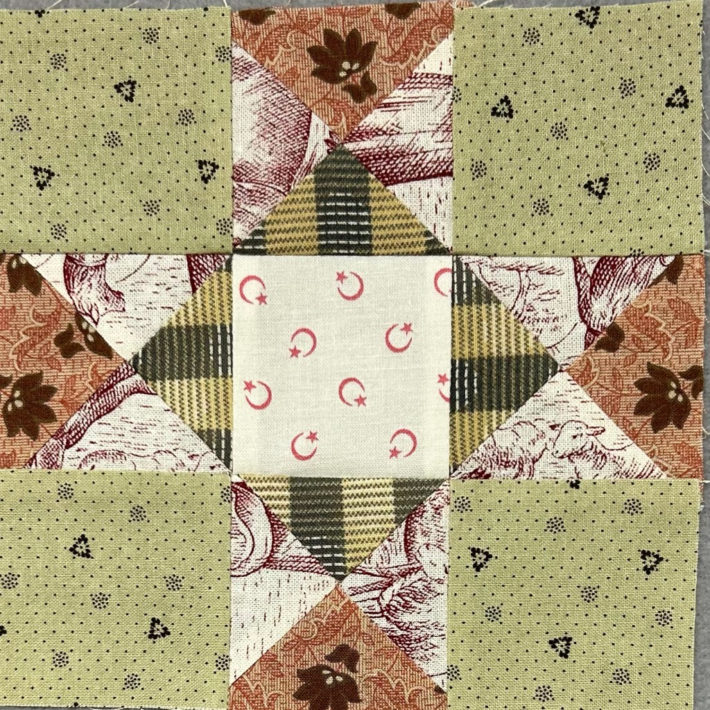 Of course, I’m not quite following the rules. I had a bin of fabrics from my Amelia Brown Rooster Medallion that I had never put away. So I decided to make all my blocks from that bin.