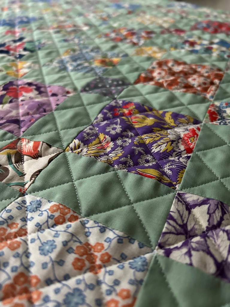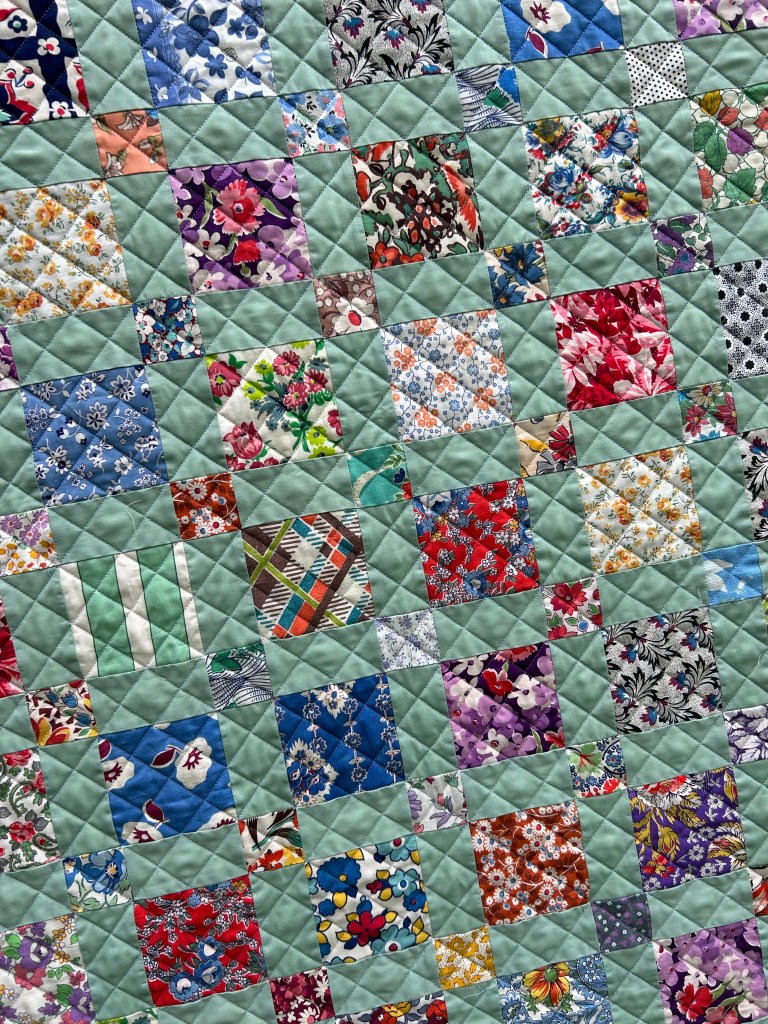 A very special quilt! The sage green background is exactly what it needed to make each fabric sing. The story behind the fabrics is the icing on the cake. I love it!