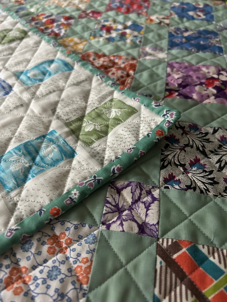I adore this quilt! Love everything about it, from the fabrics to the background, to the binding. I am curious to see what you decide to do with your feedsack fabric. I am currently working on a scrap quilt and trying to use vintage florals in it. I think that pattern would work nicely with your feedsacks if you want to see it. Blessings!