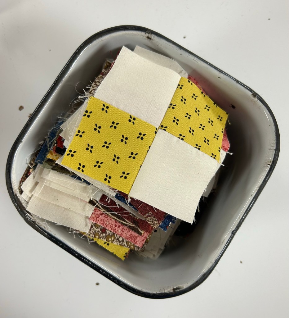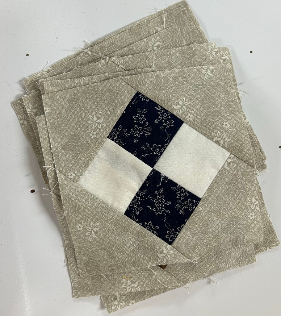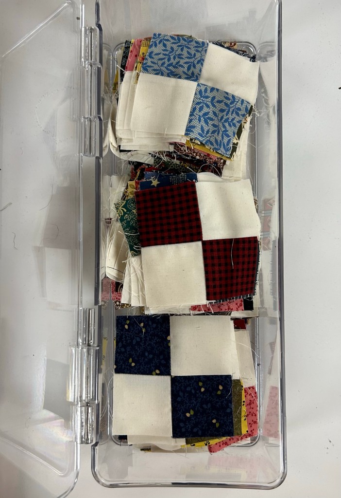 I found a little bin of 2 inch cream squares. I decided to pair them with Civil War Repro squares to make four patches as a leader/ender project.
