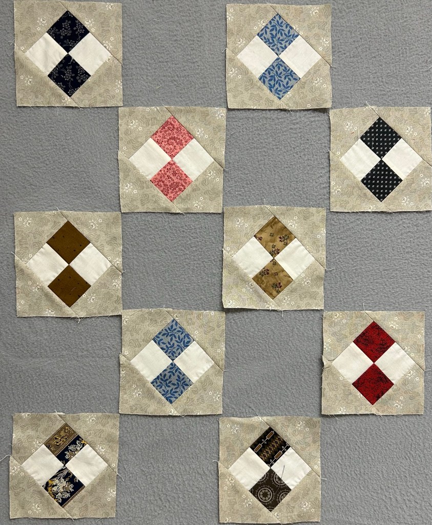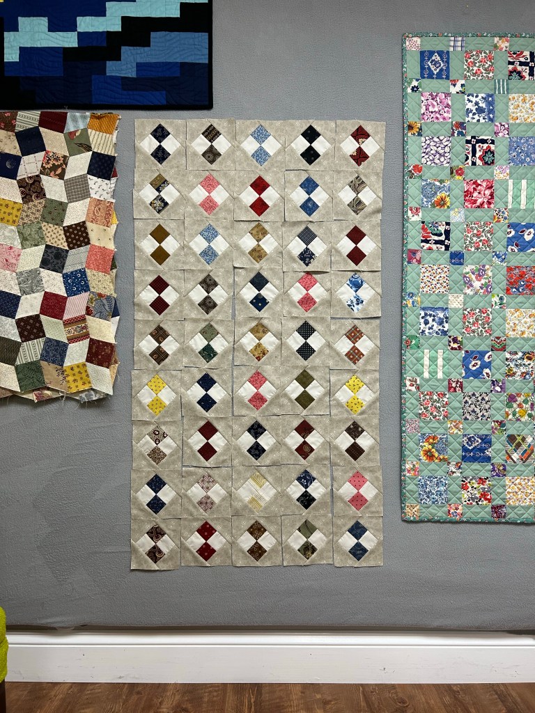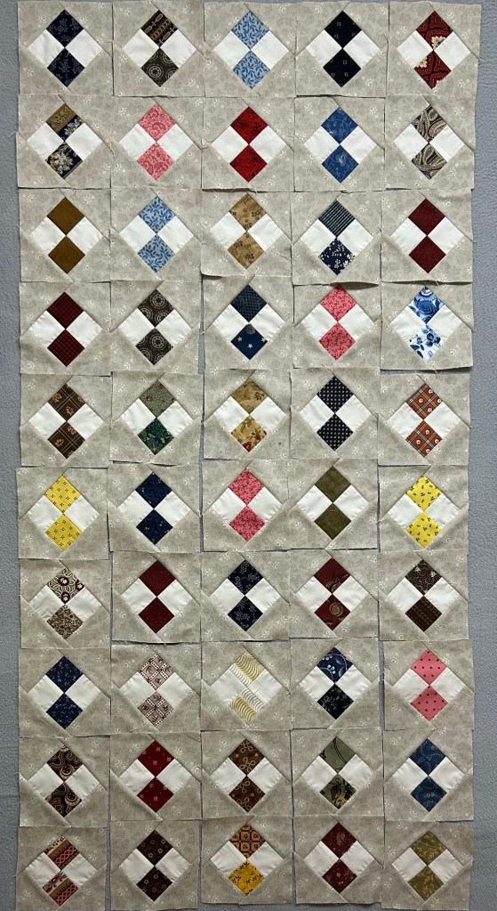 I have about half of the blocks done. I’m not sure I have enough of the fabric I used for the corner triangles. Sounds like another design challenge!