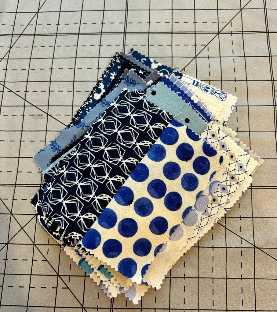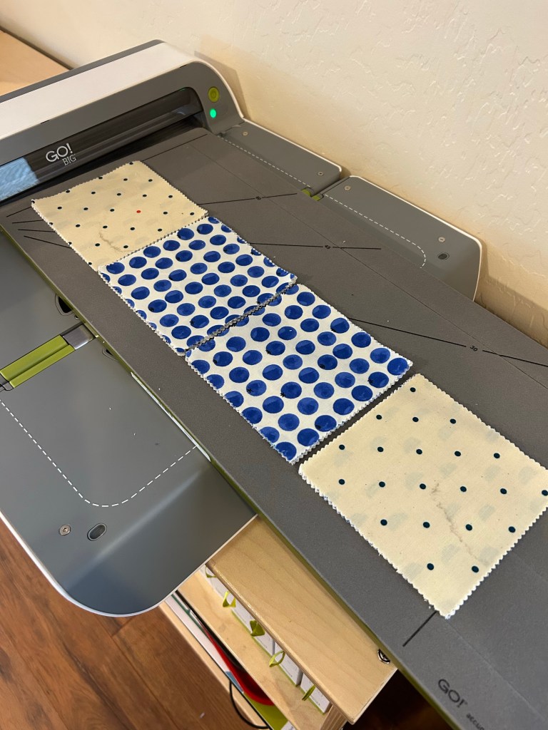I placed stacks of 5-6 squares on my 2 1/2” AccuQuilt strip cutter to cut them in half.